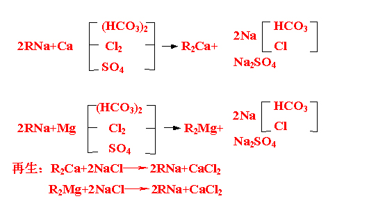 組成水質(zhì)硬度成份的鈣離子Ca2+、鎂離子Mg2+與樹脂中的鈉離子Na+進(jìn)行交換,水中的鈣離子Ca2+、鎂離子Mg2+為Na離子所取代,從而獲得水質(zhì)軟化的效果。