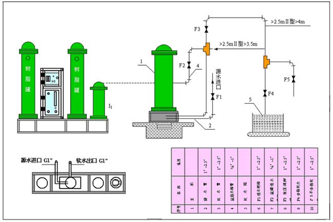 如果在原水硬度大于10mgN/L的極硬水地區(qū),必須選用Ⅱ型機(jī),Ⅱ型機(jī)的安裝是在標(biāo)準(zhǔn)機(jī)樹脂罐上安裝一加高罐即可。由于樹脂的膨脹性,裝填樹脂一定要按罐的90%容量進(jìn)行。